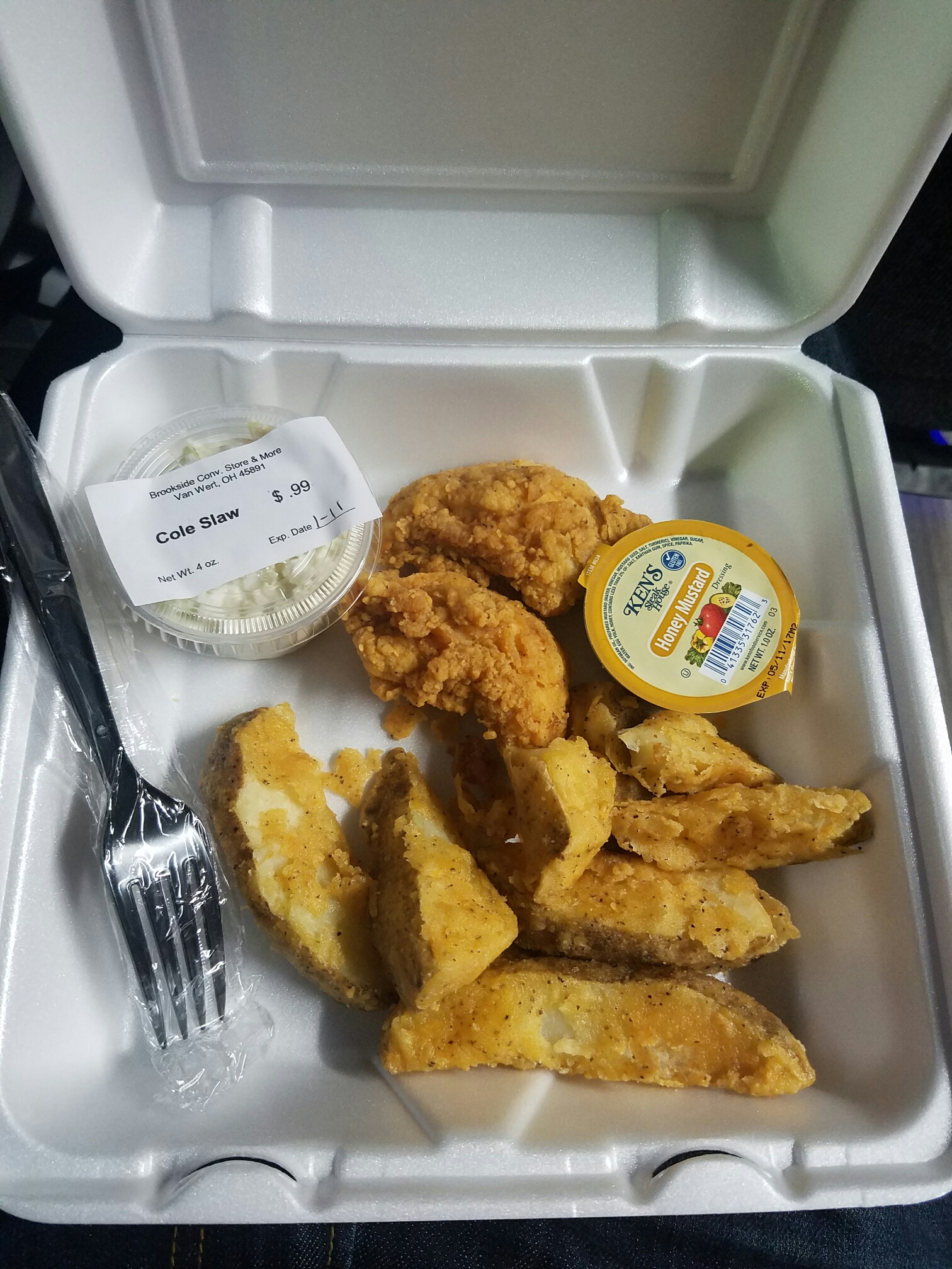 We just made it to Van Wert, OH, stop #17 and the first time I’ve gotten up since Columbus. We stopped at a gas station that served hot food, but the pickings were fairly slim. I ended up going with their chicken tenders meal (2 tenders, potato wedges, and cole slaw) for 4.39. It was decent, but being that my last hot meal was 11 hours back, I was thrilled with it.